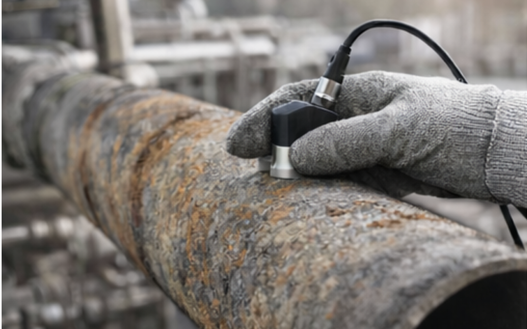 Aplicación del medidor de espesor digital por ultrasonido en tuberías metálicas, ideal para inspección de corrosión, desgaste y verificación de espesores en mantenimiento industrial.