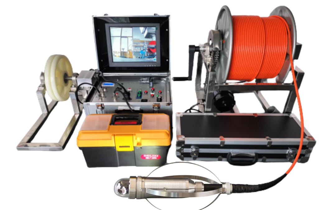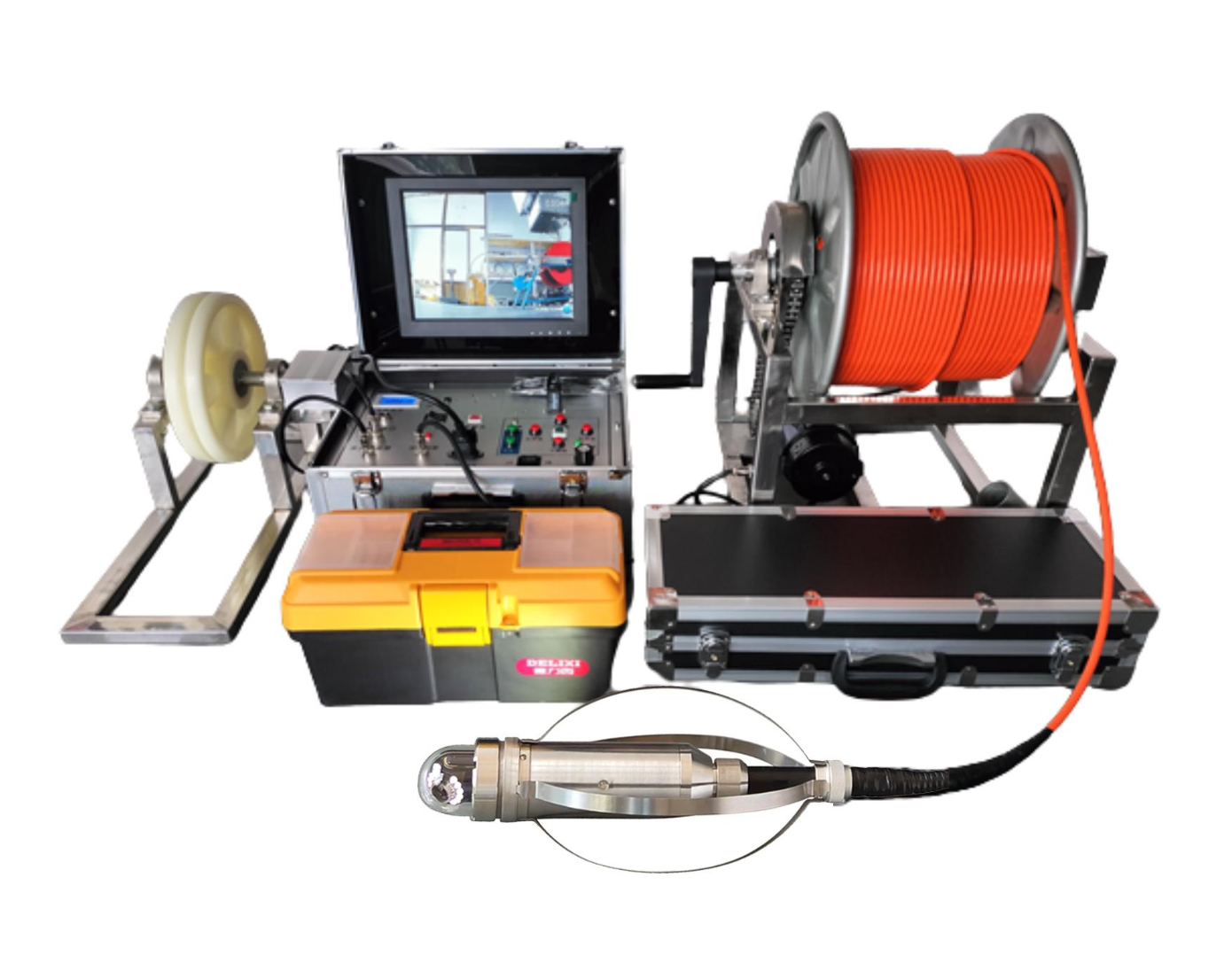 Sistema de cámara de inspección para pozos profundos hasta 500 m, apto para salmuera (saltwater). Incorpora cabezal pan & tilt en acero inoxidable, iluminación LED ajustable y protección IP68 para trabajos en ambientes sumergidos y condiciones de alta presión.